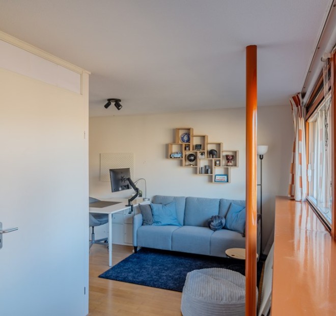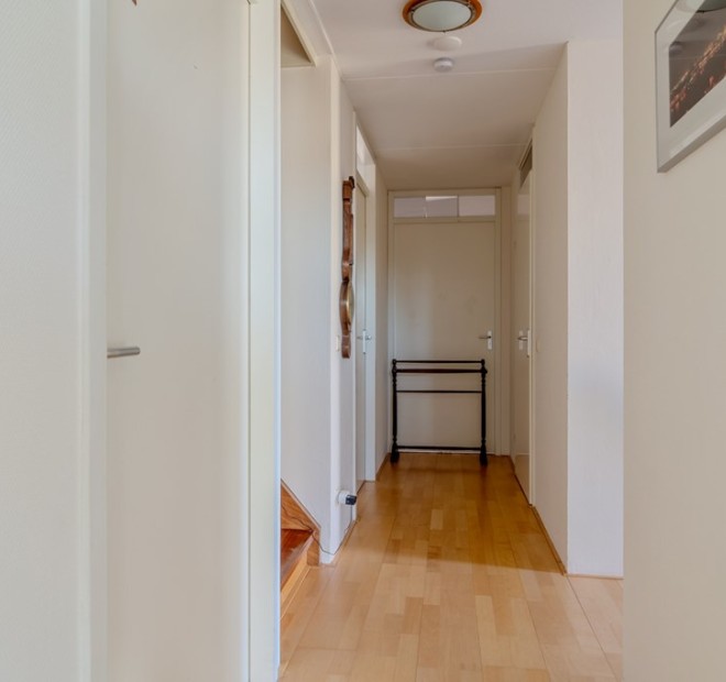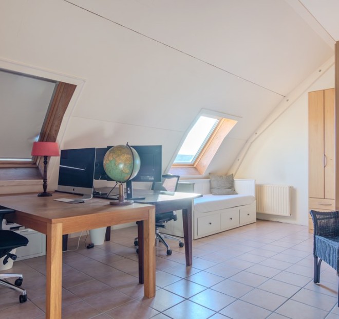 Via de vaste trap kom je op de overloop van de tweede verdieping, welke toegang geeft tot de vrije ruimte (6.36 x 6.71). Doormiddel van losse kasten is hier op dit moment een verdeling gemaakt. Aan de achterzijde zijn onder het schuine dak grote opbergruimtes gecreëerd doordat de oorspronkelijke vide vanuit de bouw is dichtgemaakt. De voorzijde is voorzien van grote dakramen. In een vaste kast zijn de Cv-ketel en box van de mechanische ventilatie gesitueerd. De wasmachine-aansluiting bevindt zich ook op deze verdieping. De ruimte is super geschikt om hier nog twee extra slaapkamers te realiseren zodat er extra privacy is in de vorm van slaapkamers op werkkamers.
